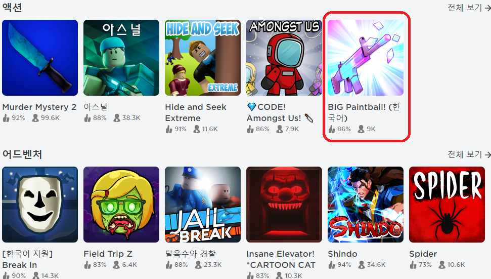 로블록스 바로가기에서 게임을 시작하는 방법은 간단합니다. 회원 가입하고 로그인해서 해보고 싶은 게임을 클릭하면 돼요. 저는 BIG Paintball이란 게임을 눌러볼게요.