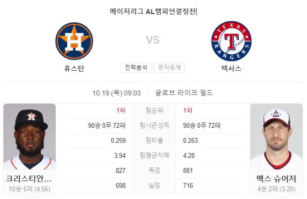오늘 10월 19일 홈구장인 미국 텍사스주 알링턴 글로브 라이프 필드에서 열리는 ALCS 3차전 선발 투수로 맥스 슈어저를 낙점했습니다. 텍사스는 워싱턴 내셔널스 시절 월드시리즈 우승 경험이 있는 베테랑 슈어저를 내보내면서 시리즈 우위를 완벽하게 점하겠다는 계획입니다.