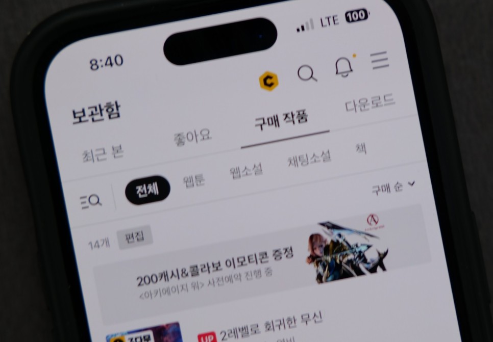 보관함에서 상단을 보면 '최근 본' 작품이 있습니다. 여기서 '구매 작품'을 보면 됩니다.