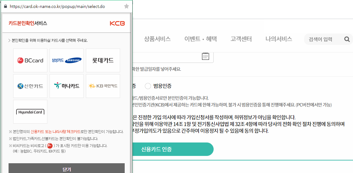 본인 명의의 신용카드가 필요합니다. 만약 신용카드가 없거나 가족카드 등의 타 명의의 신용카드라면 인증이 되지 않습니다. 또한 본인명의라도 체크카드는 안됩니다(나라사랑 체크카드 제외). 그래서 신용카드가 없다면 다른 방법을 사용해야 하는데요.